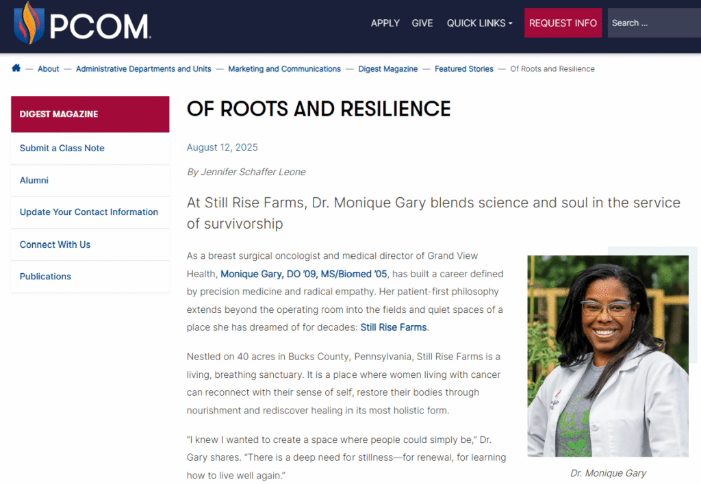 That realization inspired me to create Still Rise Farms. I imagined a place where people navigating cancer and chronic illness could explore evidence‑informed wellness practices — such as nutrition, movement, and mindset strategies — in a supportive environment that complements their medical care. I chose this farm because it offered space for community, learning, and growth, and the name “Still Rise” reflects the idea that you can be still, recover strength, and rise again.